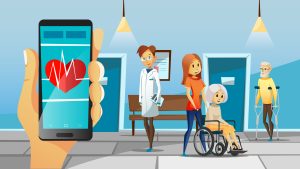 Hospital and old patients illustration of woman in wheelchair, man on crutch for doctor medical help cartoon concept